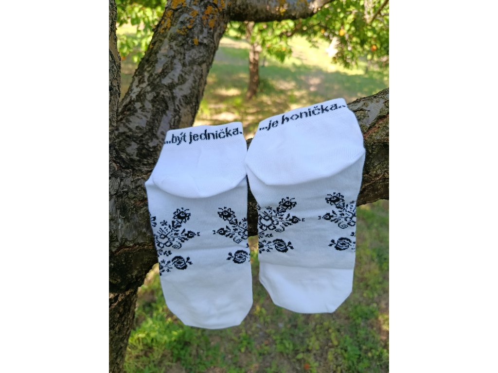 Stylové a pohodlné ponožky nízké kotníčkové s folklórním motivem a vtipným nápisem "....být jednička je honička" toto pravdivé rčení jistě ocení hlavně ženy a využijí tyto ponožky nejen na folklórní akce. Hodí se na běžné nošení i jako milý dárek. Díky kvalitnímu materiálu se příjemně nosí a vydrží dlouho.