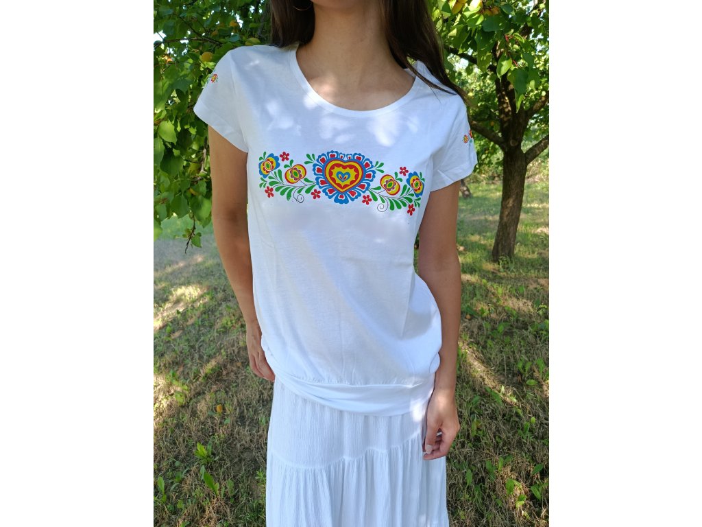 Dámské bílé tričko s folklórním motivem. Tričko je ušité ze 100% bavlny, takže bude pohodlné na každodenní nošení. Má volnější dámský střih a spodní lem je zakončený pružným patentem, díky kterému tričko hezky sedí, ale nikde netáhne.