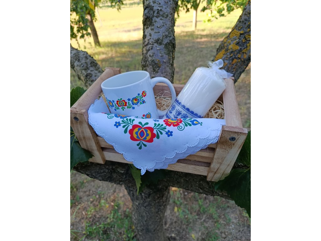 Dřevěná bedýnka o rozměrech 24 x 14 x 12 cm, hrníček s folklórním motivem (250ml), prostírka bílá s folklorním motivem 35 x 35 cm, svíčka s folkórním motivem výška 15 x 6 cm. Výplň bedýnky dřevitá vata. Bedýnku s obsahem dárkově zabalíme do celofánového papíru!