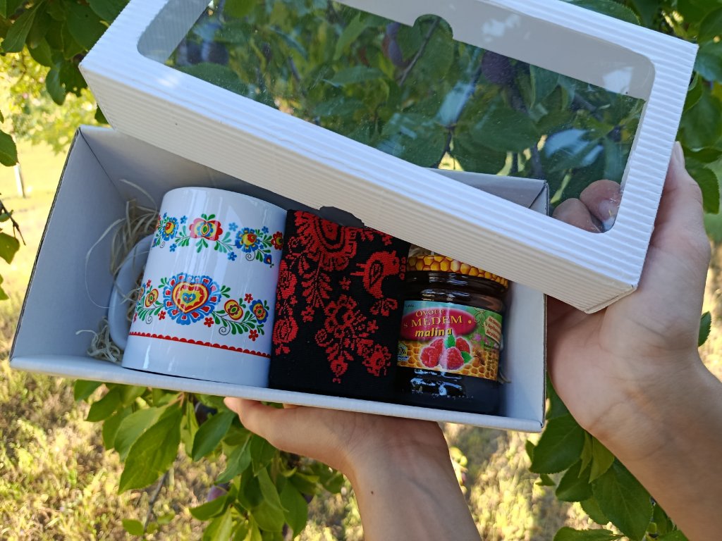 Zabaleno v papírové dárkové krabičce. Balíček obsahuje hrníček s folklórním motivem (250ml), ponožky folklórní vysoké, dle Vámi zadané velikosti, a med ovocný z Dolních Dunajovic výběr příchutě dle aktuálních zásob.