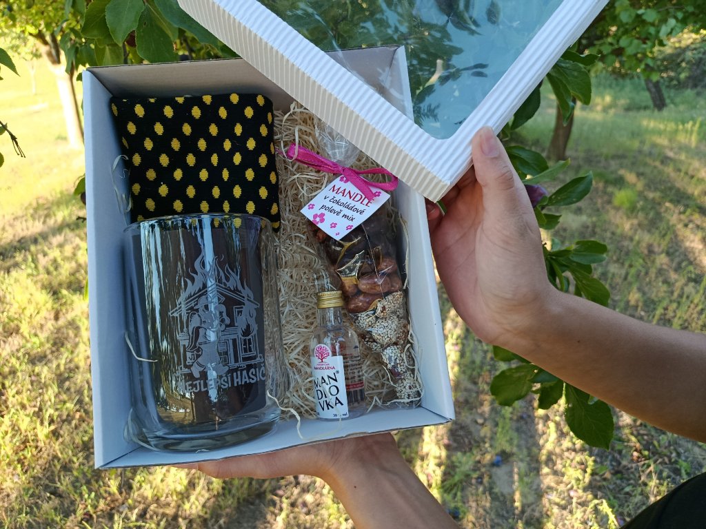 Zabaleno v papírové dárkové krabičce. Balíček obsahuje sklenici (tzn. krygl 500ml) s nápisem "Nejlepší hasič", ponožky dle Vámi zadané velikosti, kornout slaných mandlí a malou skleničku mandlovice od Mandlárna Hustopeče.
