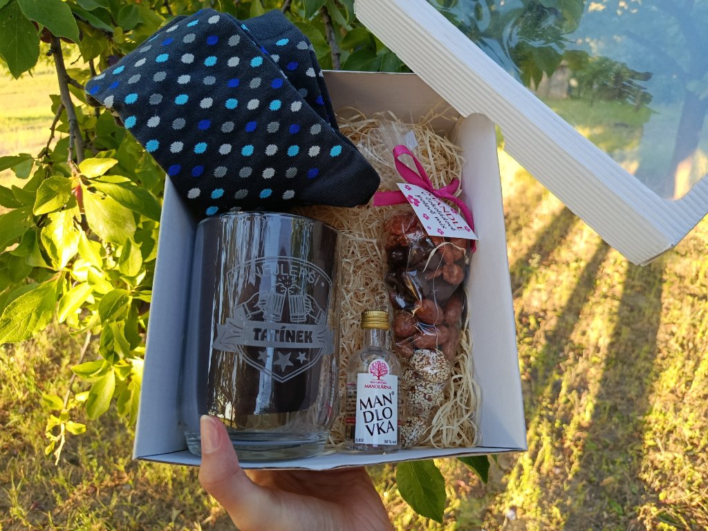 Milý dárek pro nejlepšího tatínka na světě, který jistě potěší a neurazí jak k narozeninám tak i o Vánocích. Zabaleno v papírové dárkové krabičce. Balíček obsahuje sklenici (tzn. krygl 500ml) s nápisem "Nejlepší tatínek", ponožky dle Vámi zadané velikosti, kornout slaných mandlí a malou skleničku mandlovice od Mandlárna Hustopeče.