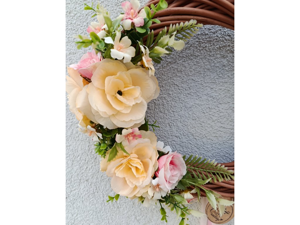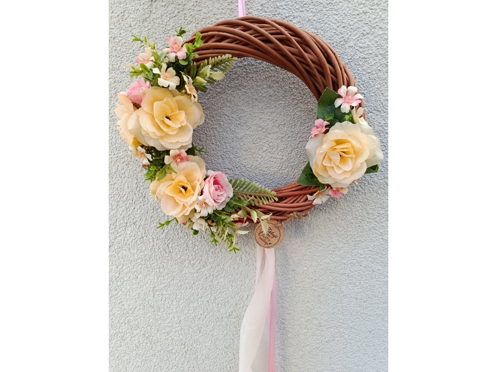 Proutěný věnec přírodní s čajovými růžemi, doplněný o jemně růžové kvítky. Vhodný na jarní a letní měsíce na vstupní dveře nebo kamkoliv do interiéru.