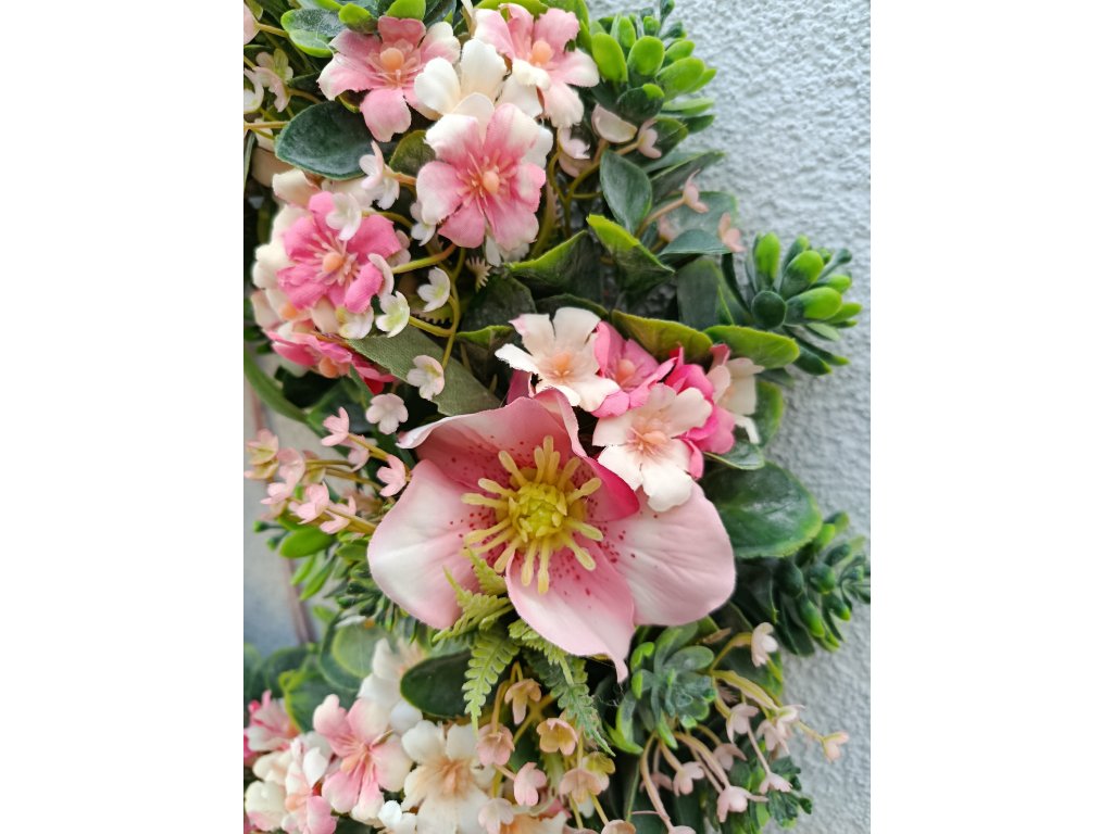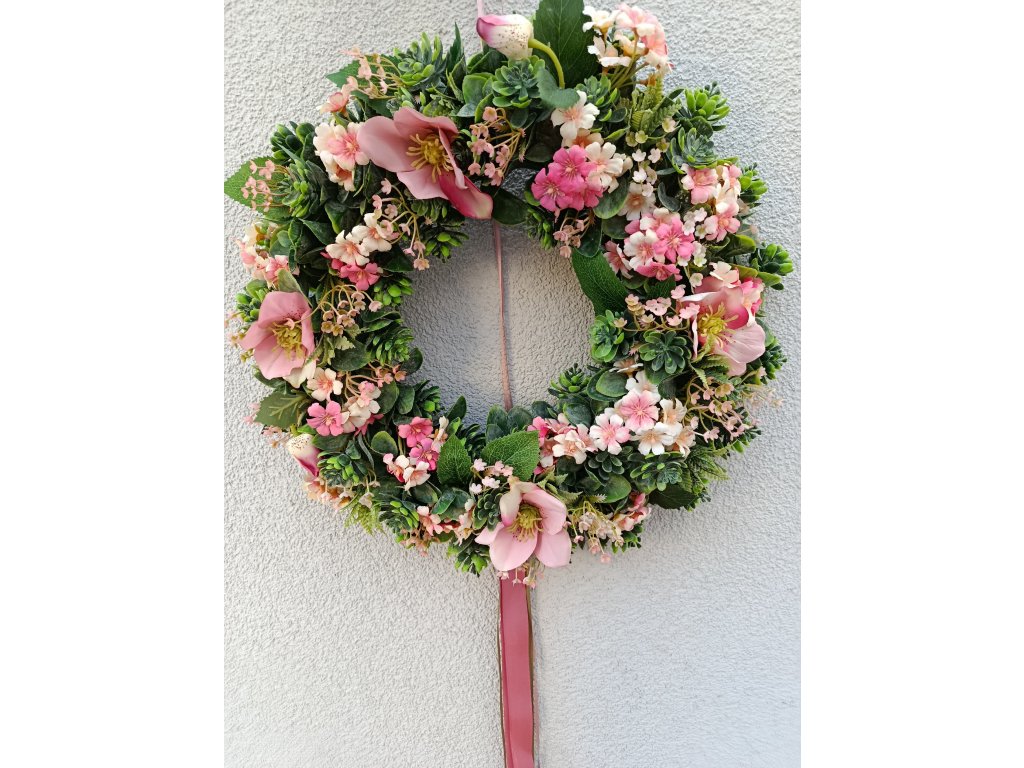 Chmelový věnec v růžových tónech. Moderní věnec s růžovými květy čemeřice a drobnými kvítky v růžových odstínech. Věnec se hodí na jarní i letní výzdobu vašich vstupních dveří nebo i do interiéru.