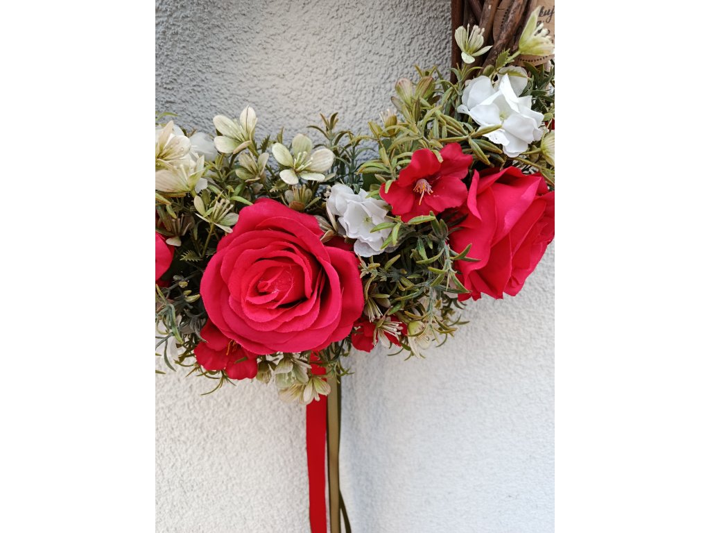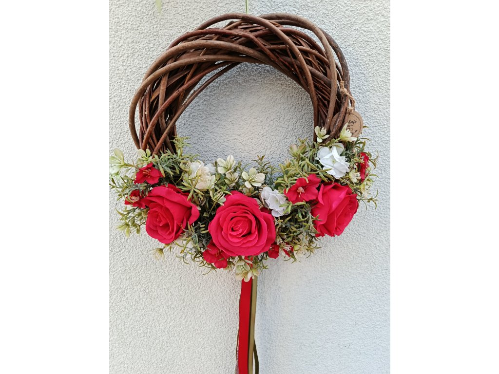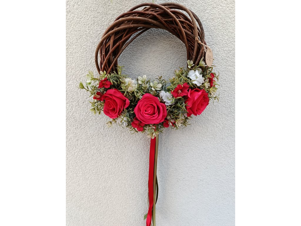 Proutěný věnec s červenými růžemi. Vhodný na vstupní dveře nebo kamkoliv do interiéru.
