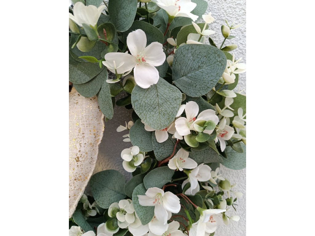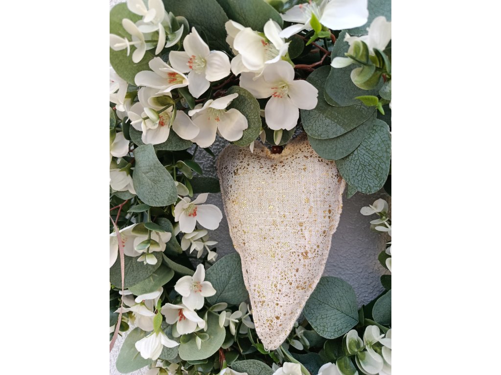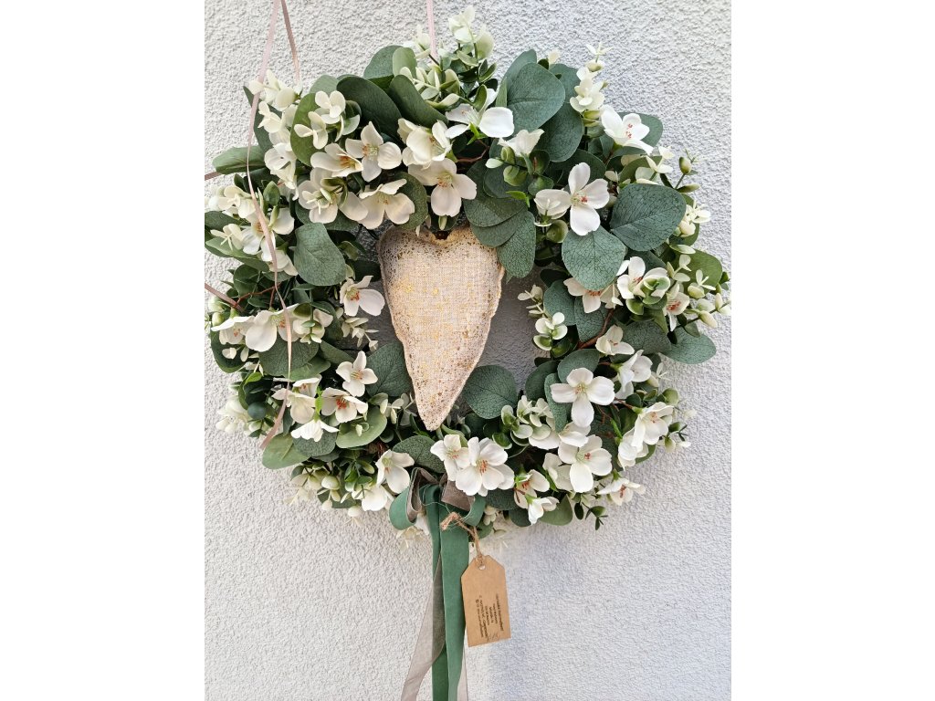 Eukalyptový moderní věnec s bílými kvítky a velkým srdcem. Krásná moderní dekorace nejen na vaše vstupní dveře, ale i do interiéru.