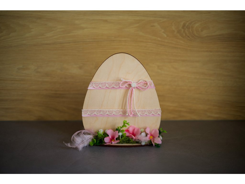 Dřevěné velikonoční vajíčko ozdobené růžovo-bílou mašličkou a umělými květinami. Krásná něžná jarní dekorace do vašich domovů.