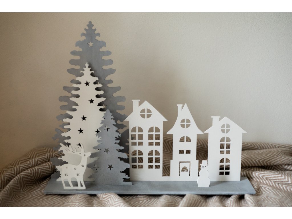 Dřevěné svítící městečko s domečky a stromy přinese do vašeho domova kouzlo zimní vánoční atmosféry. Světýlky jsou na baterky, které jsou součástí balení. Krásně rozzáří každý kout a vytvoří útulnou atmosféru.
