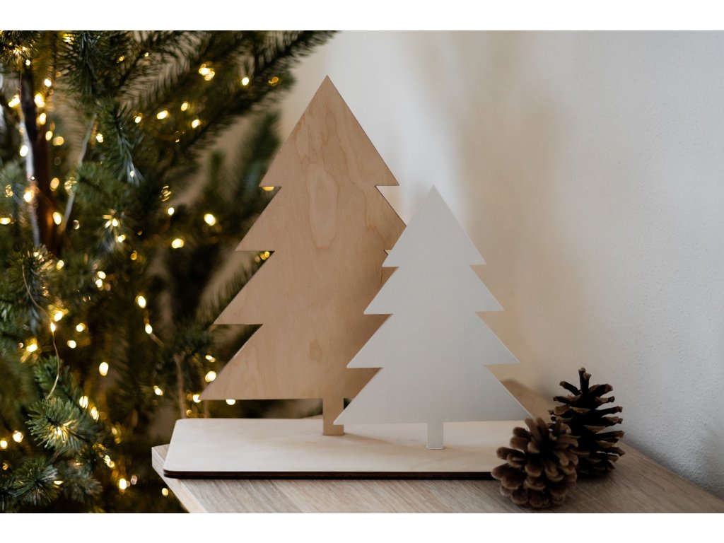 Dva dřevěné stromečky na podstavci, jeden v přírodní a druhý v bílé barvě, krásně ozdobí váš domov během zimního období.