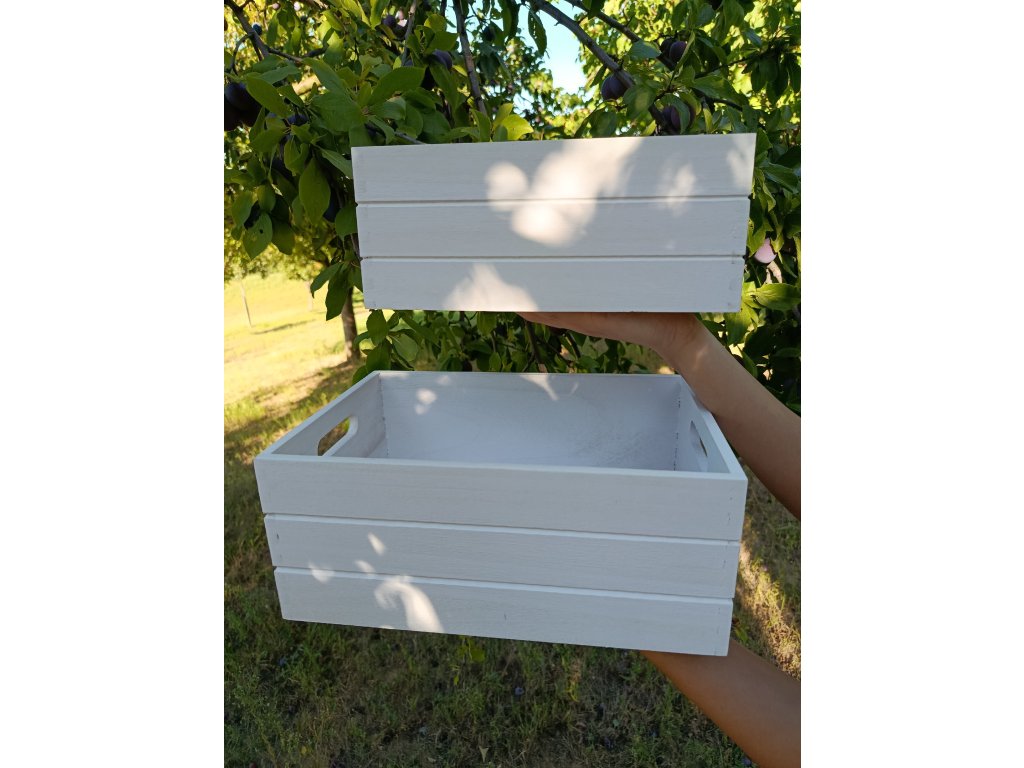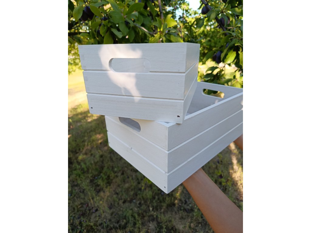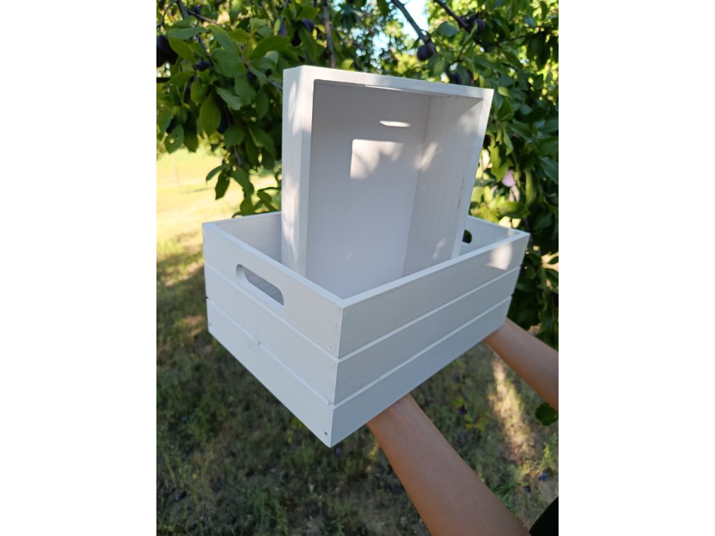 Dřevěná krabička bílá povrchová úprava. Na bocích s otvory (uchy). Praktická krabička pro originální předání dárku, na uložení praktických potřeb v domácnosti aj. Můžete zakoupit ve dvou velikostech