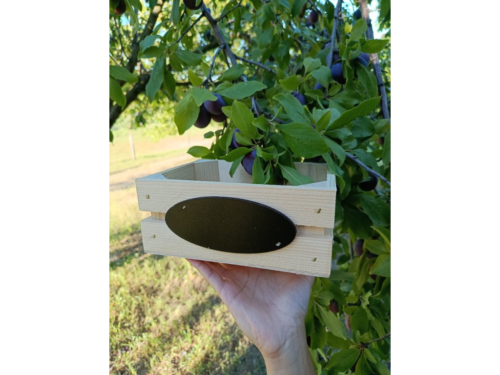 Dřevěná krabička malá bez povrchové úpravy s černou oválnou cedulkou, kterou můžete popsat bílým fixem nebo křídou. Praktická krabička pro originální předání dárku, na uložení praktických potřeb v domácnosti aj.
