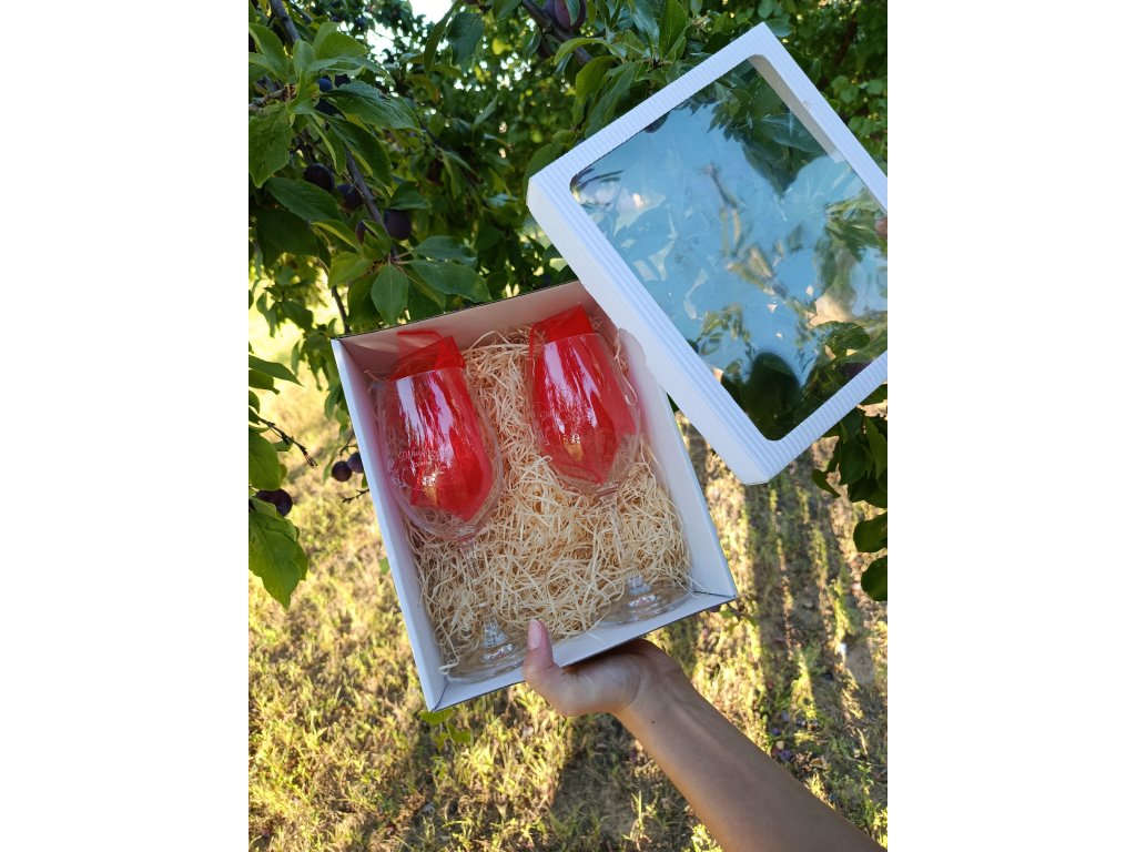 Dárková papírová krabička bílá z jednovrstvé hladké lepenky, víko z vlnité lepenky s průhlednou fólií. Velikostně odpovídá např. k předání dvou kusů skleniček na víno o objemu 300 ml.
