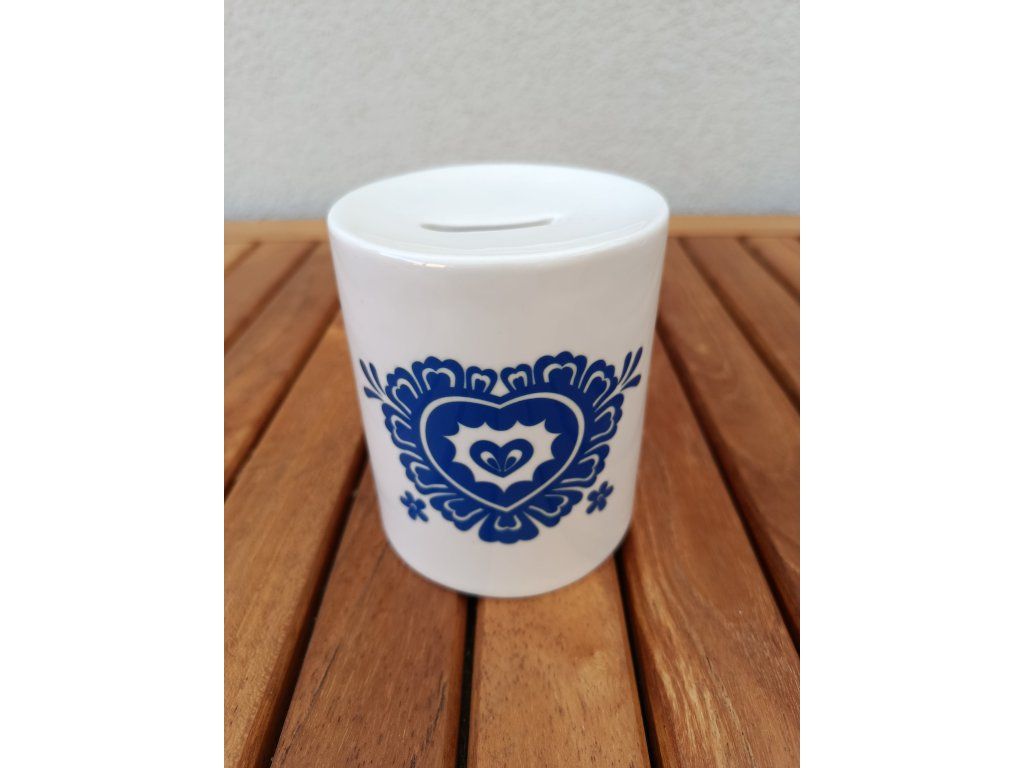 Keramická pokladnička s folklórním motivem srdce v modré barvě. Vybírat můžete i z dalších 5 ti designových variant.