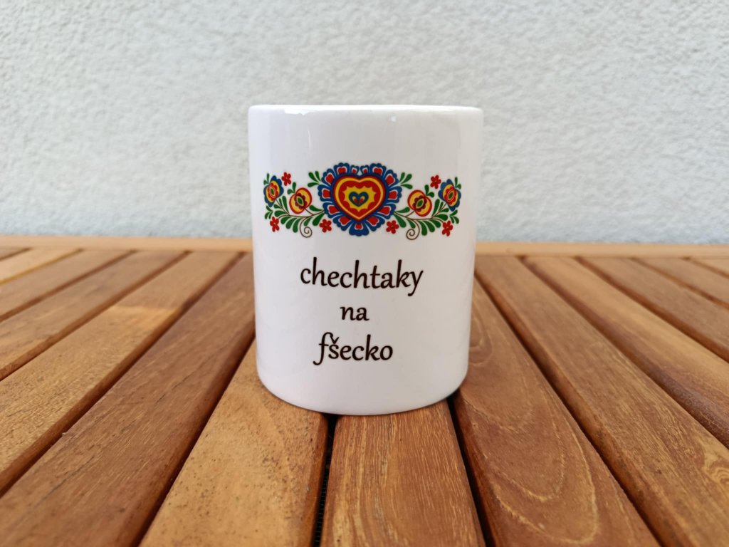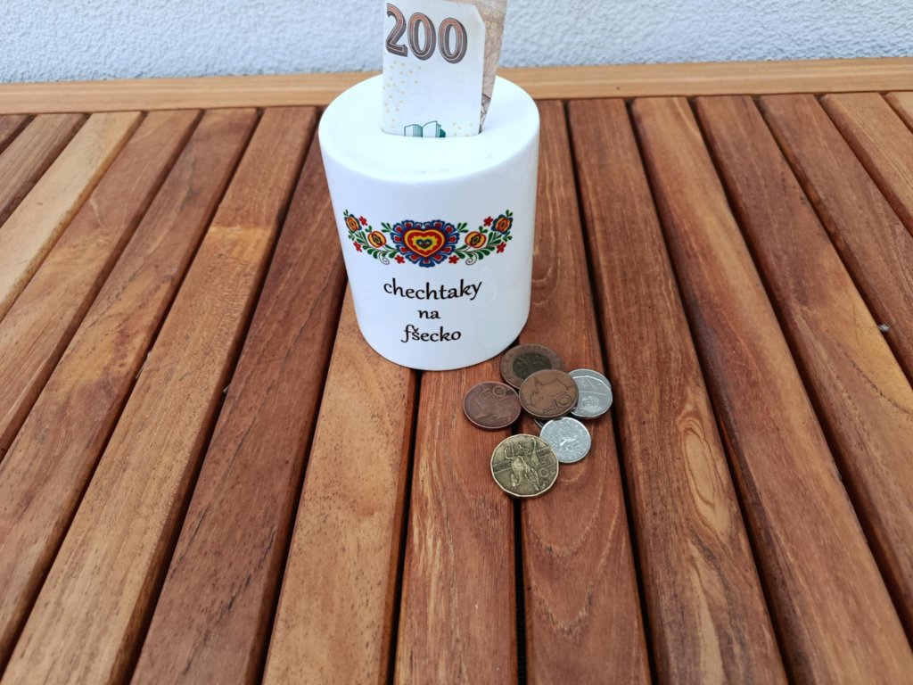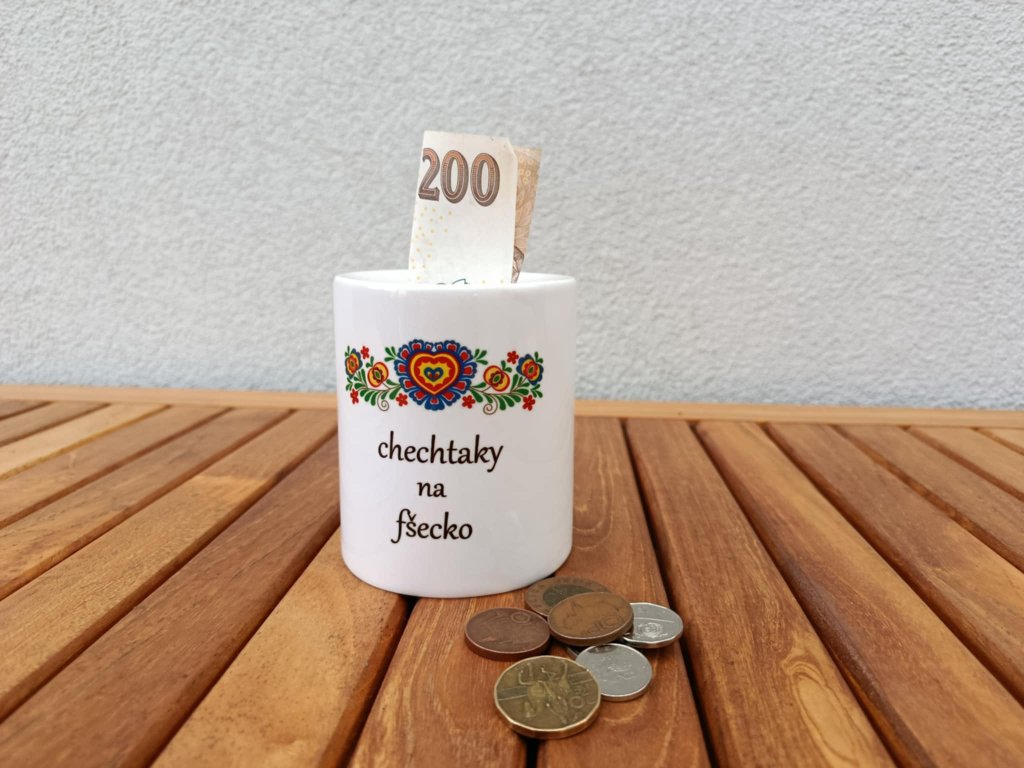 Keramická pokladnička s folklórním motivem a originálním veselým nápisem v nářečí "chechtaky na fšecko" =(peníze na vše, prostě na vše je možné šetřit :-)