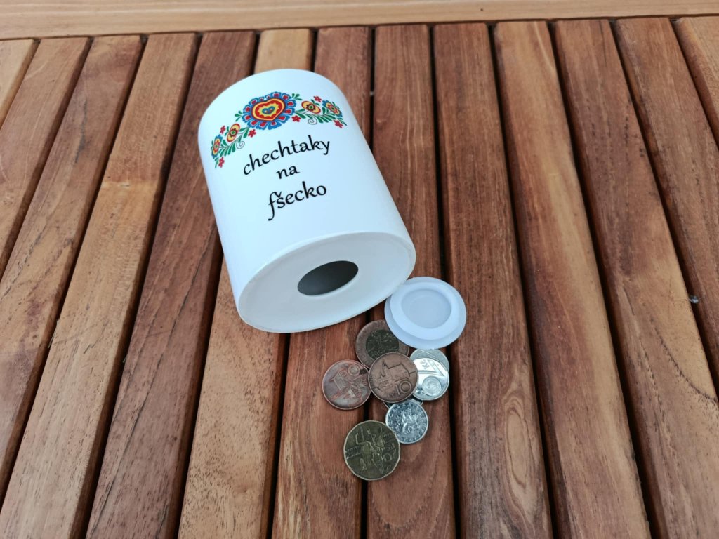 Výška pokladničky je 9,5 cm, průměr 8,2 cm.