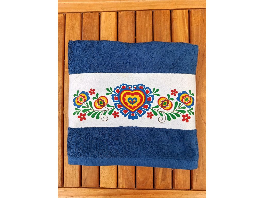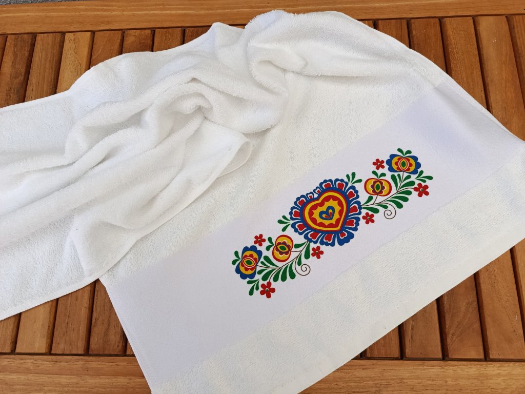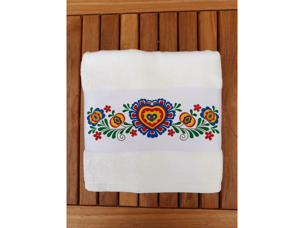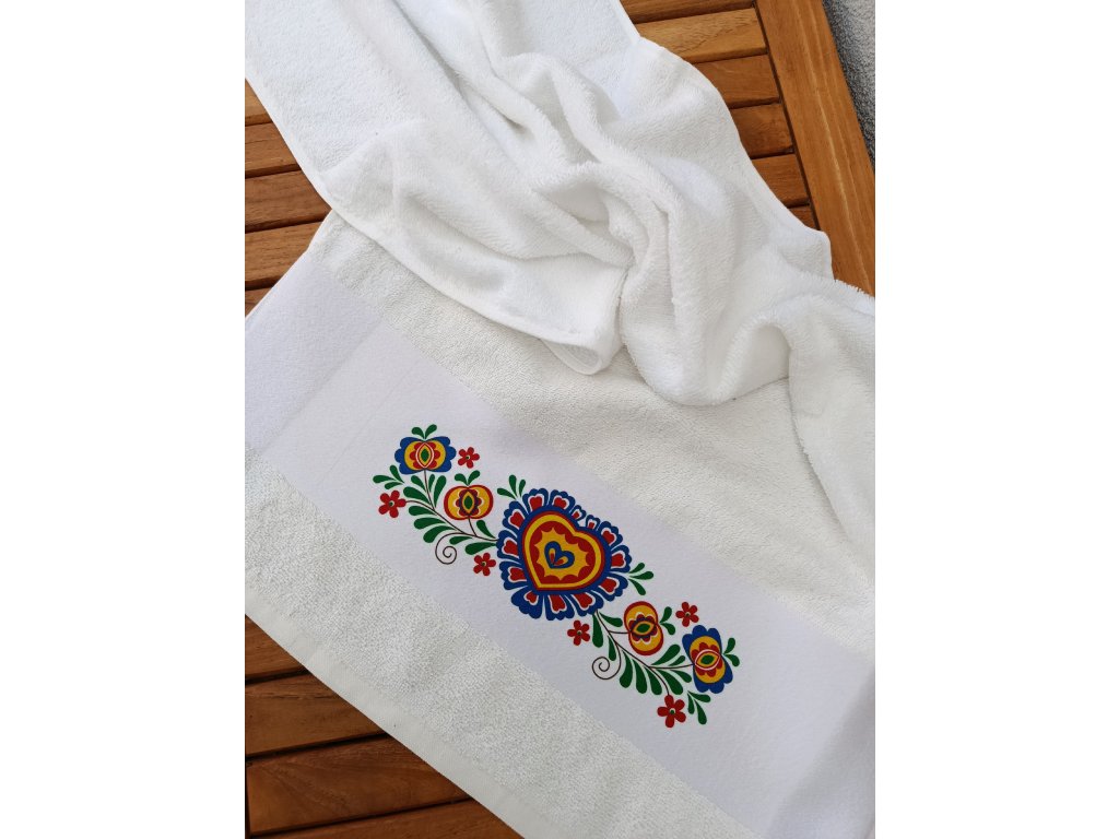 Ručník s folklórním motivem, který Vás folklorně naladí i v koupelně :-) Folklórní ručník se může stát i krásným dárkem do výbavy nebo pro milovníky tradic a folkloru. Ručník rozměr 50 x 100 cm, 100% bavlna, gramáž 400gr/m2. Bílý pruh - plocha pro tisk - rozměr 50 x 11 cm, motiv má rozměr 25 x 7 cm. Poutko na pověšení.