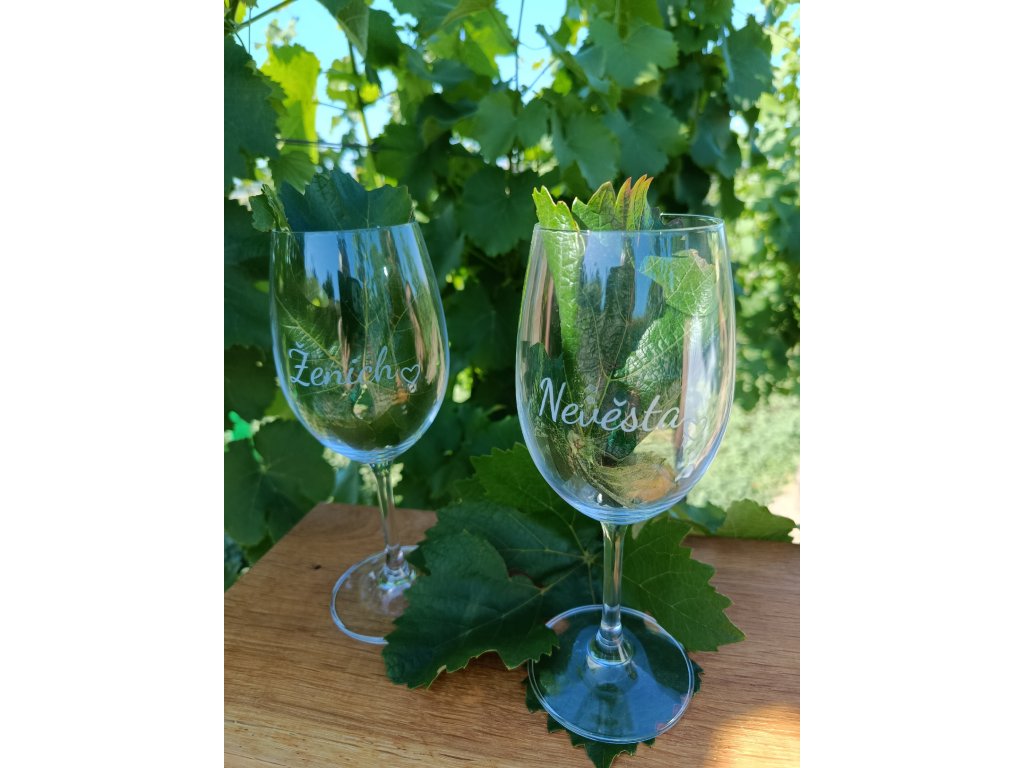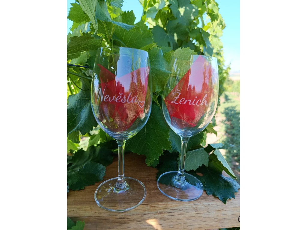 Sklenice na víno nevěsta a ženich s malým srdíčkem. Krásný dárek pro nastávající novomanžele. Tyto skleničky jim budou připomínat jejich šťastný svatební den. Připijte si našimi skleničkami s radostí.