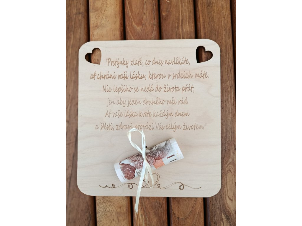 Originální dřevěná destička - " svatební přání " se svatebním přáním , ve spodní části je šňůrka k přivázání finančního obnosu.