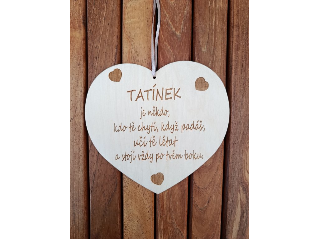 Dřevěné srdíčko s krásným textem, milý dárek pro naše milované tatínky jistě vykouzlí krásný úsměv a zahřeje na srdci. Srdíčko s textem pro tatínky můžete darovat ke svátku, k narozeninám, na Den Otců (21.6.), ale i o Vánocích, příležitostí k obdarování našich tatínků je jistě spousta.