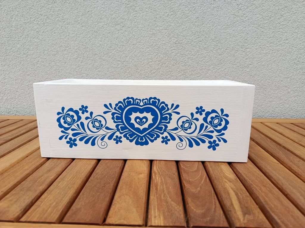 Originální dřevěný truhlík folklórní určený k celoročnímu dekorování vašeho domova. Pro milovníky folkloru, vína a vinařské nadšence, tuto stylovou dekoraci můžete použít k výzdobě vinného sklepa, venkovního parapetu, výzdoba na folklorních akcích jako jsou otevřené sklepy, výstava vín apod.