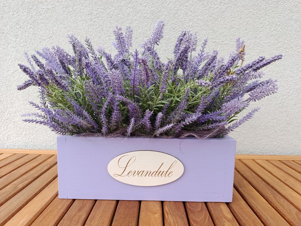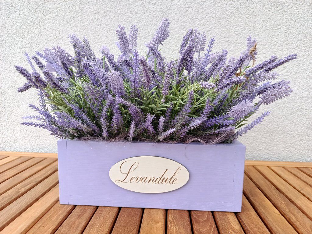 Pro milovníky levandule a fialové barvy tu máme originální dřevěný truhlík s nápisem Levandule, určený k celoročnímu dekorování. Použít můžete umělé větvičky, ale i živou levanduli, která vám zpříjemní každodenní atmosféru v každém koutě vašeho domova, u vchodových dveří nebo na okenním parapetu.