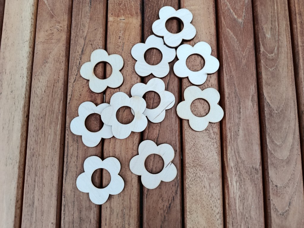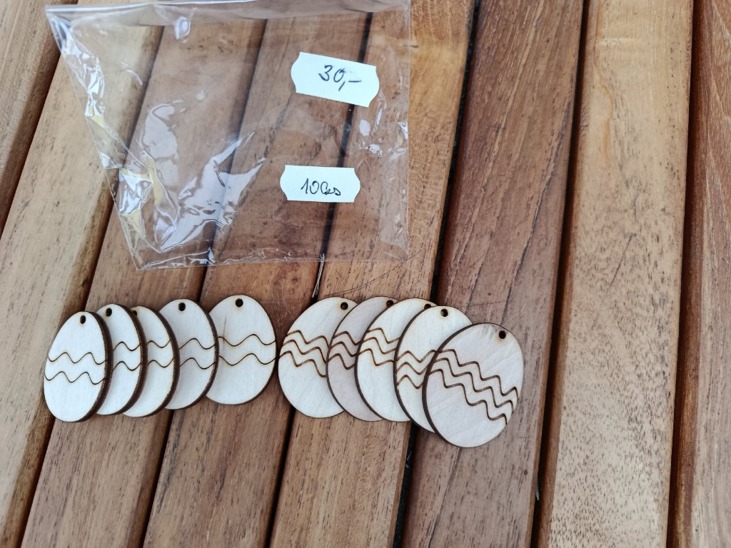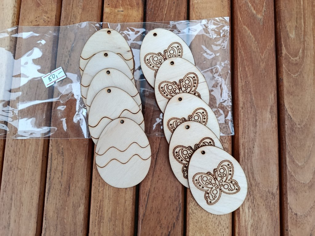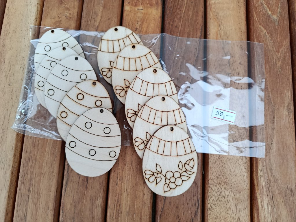 Sada 10 ks dřevěných vajíček a nebo 10 ks květ na pověšení. Vypadají úžasně jen tak přírodní na větvičkách a na barevných stuhách. Materiál dřevěná překližka 3 mm.