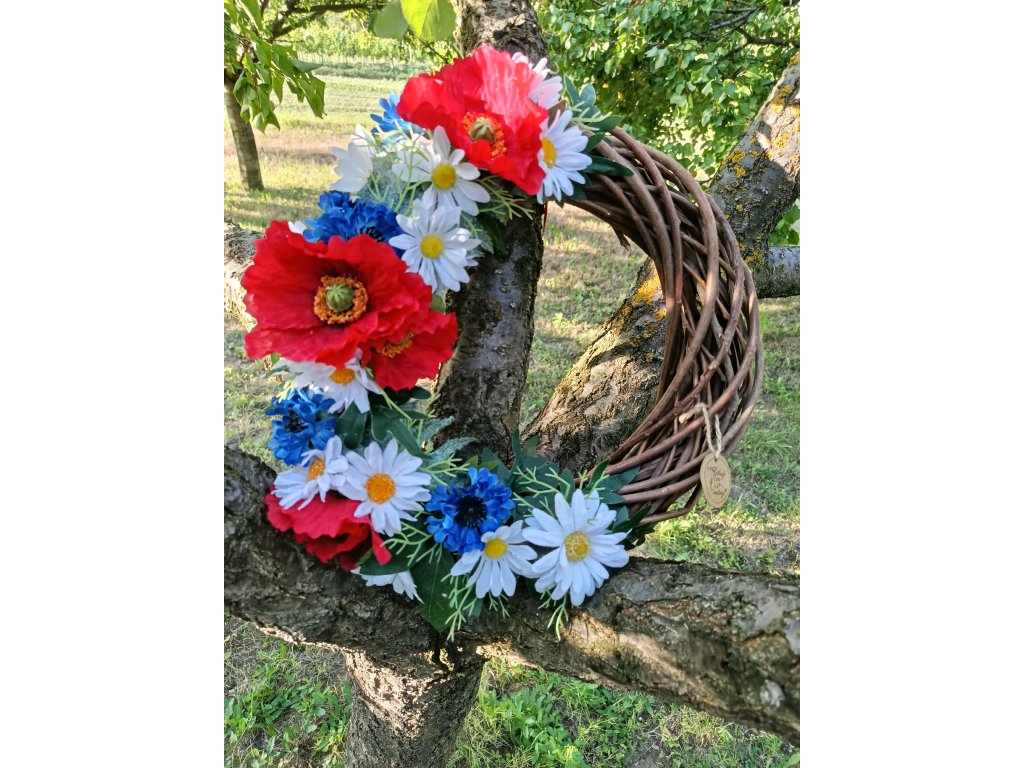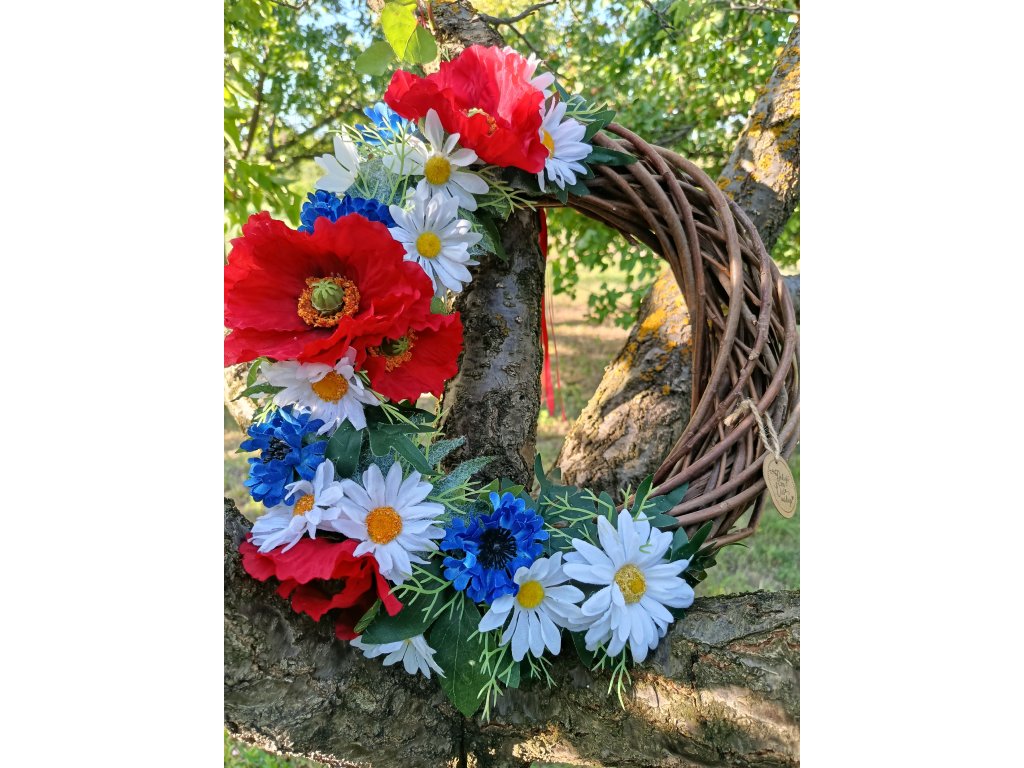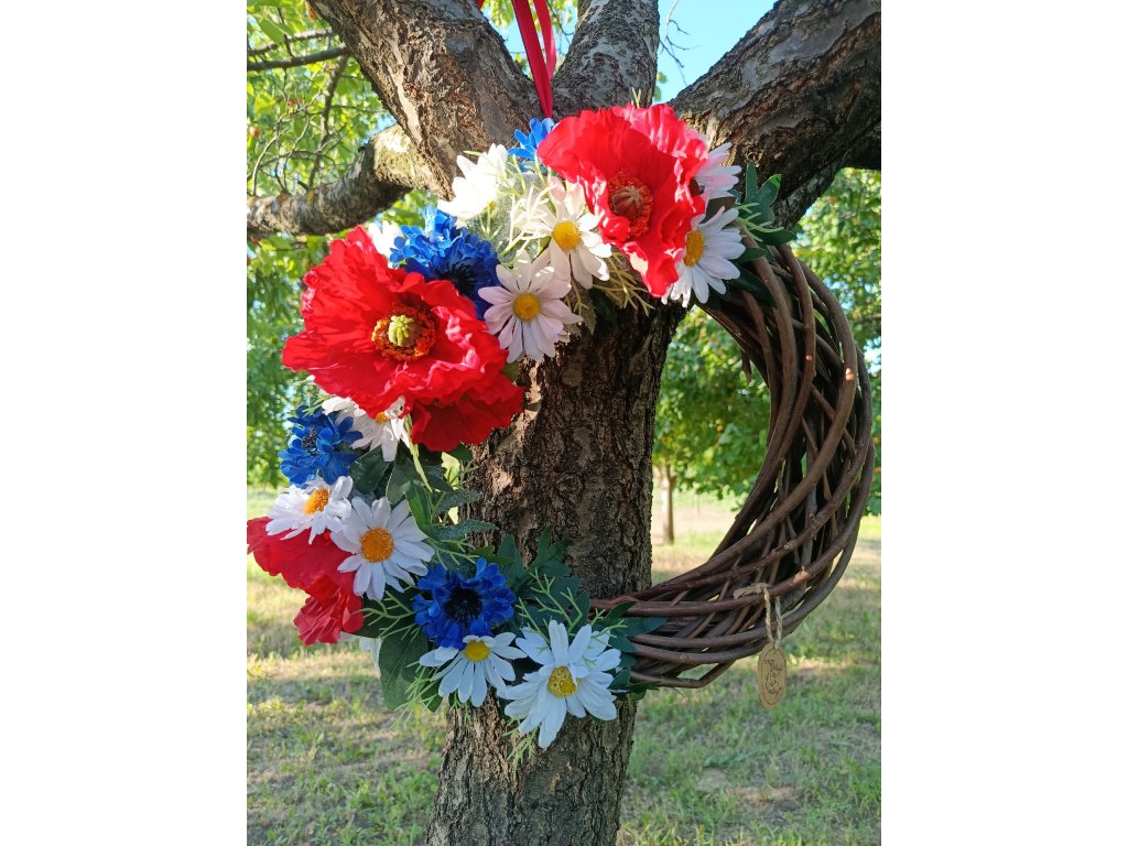Velký folklorní věneček, plný vlčích máků, kopretin a chrpy na tmavém proutěném věnci. Věneček ozdobí vaše vstupní dveře v letních měsících nebo v době hodů, ale může se stát i krásnou dekorací na veřejných akcích jako jsou hody, otevřené sklepy, krojové plesy, folklorní festivaly no prostě fantazii na jeho použití se meze nekladou.